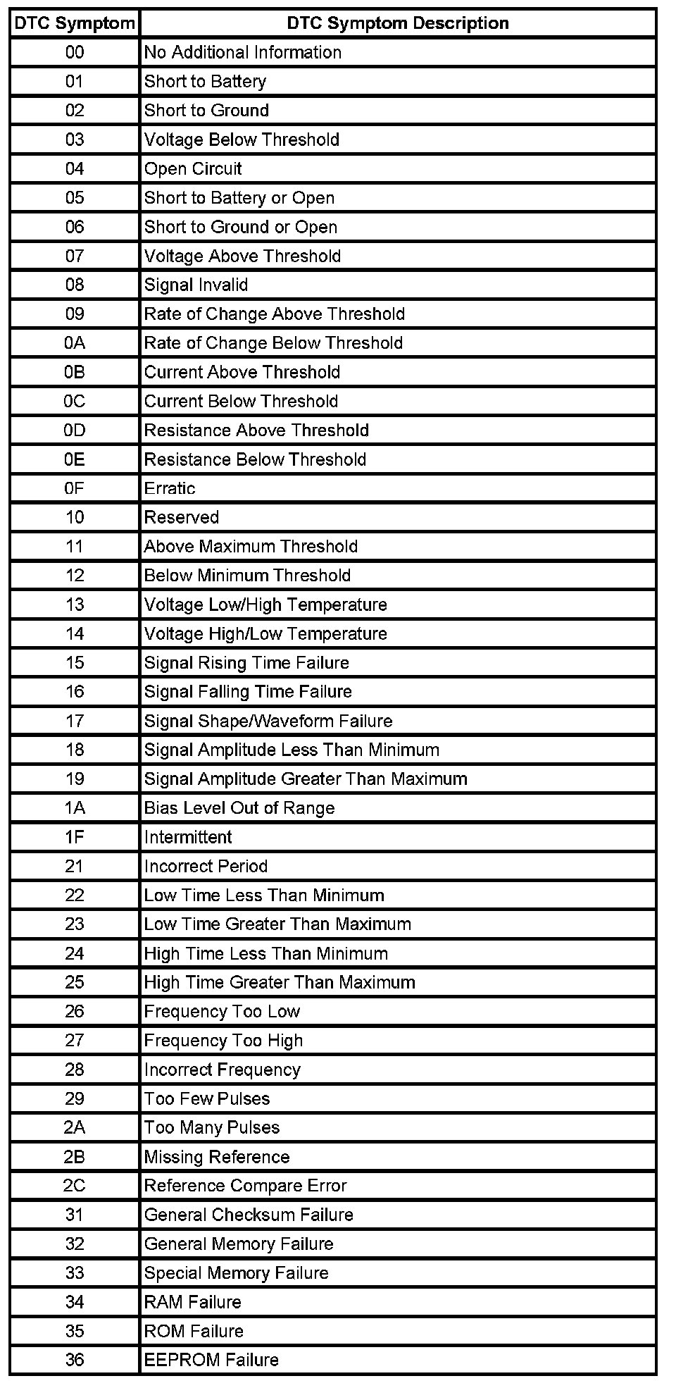 A DTC symptom is a 2-digit number which adds additional detail to a DTC. The DTC symptom provides additional information without requiring a large increase in the number of new DTCs.