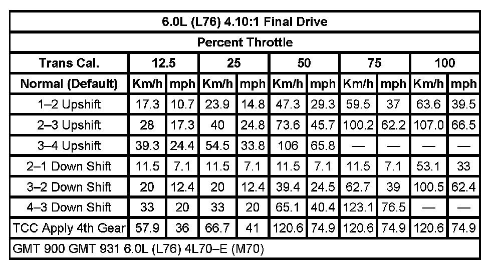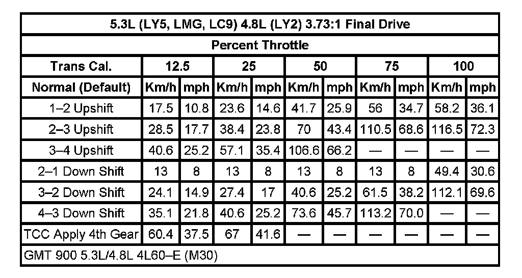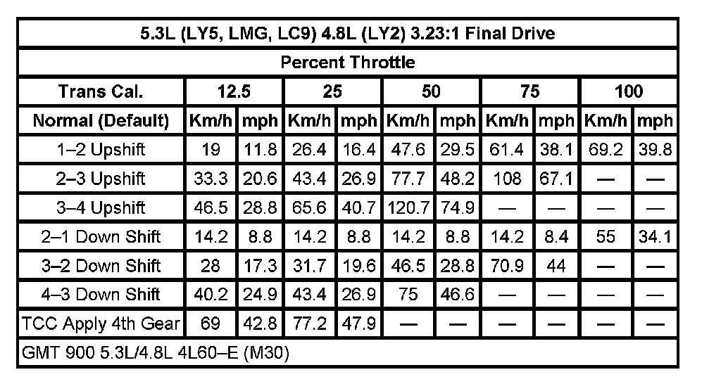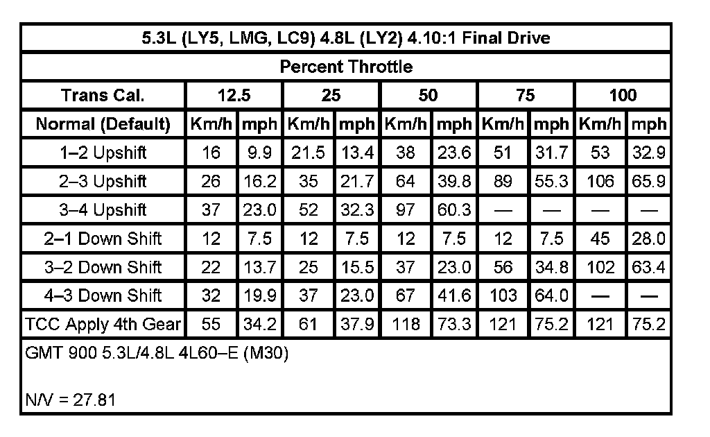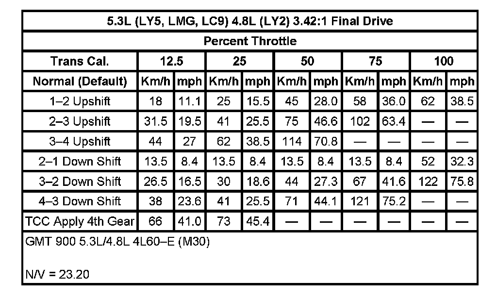 Shift Speed5.3L (LY5,LMG,LC9) 4.8L (LY2) 3.42:1 Final Drive: