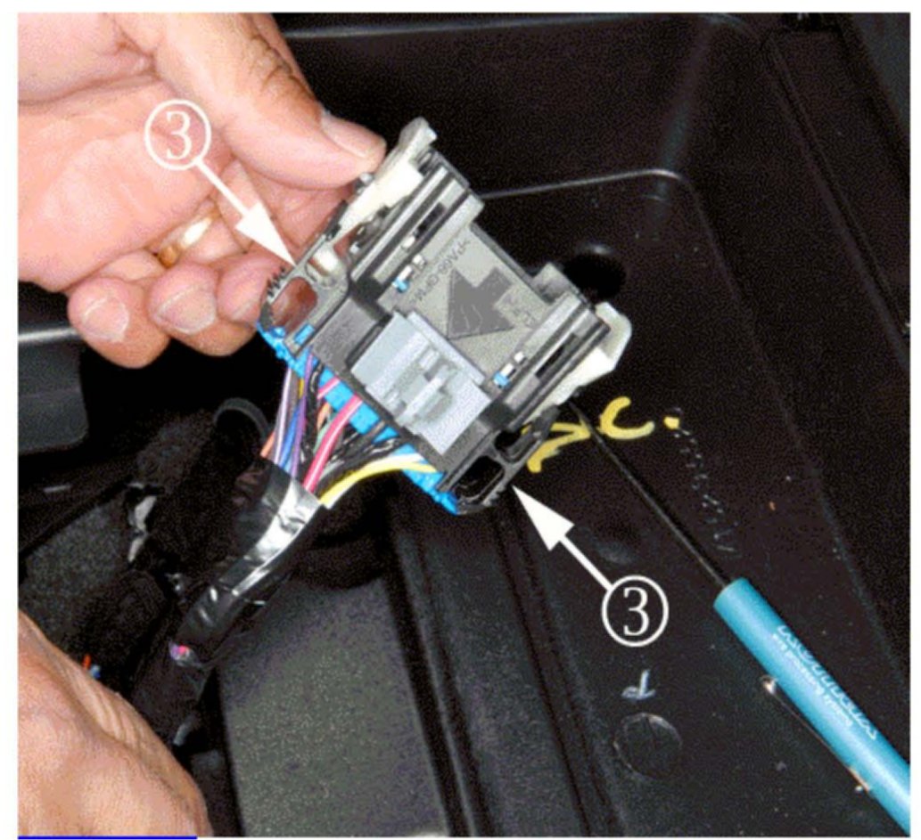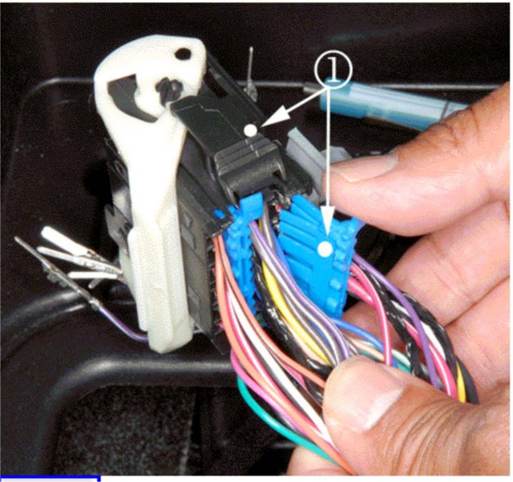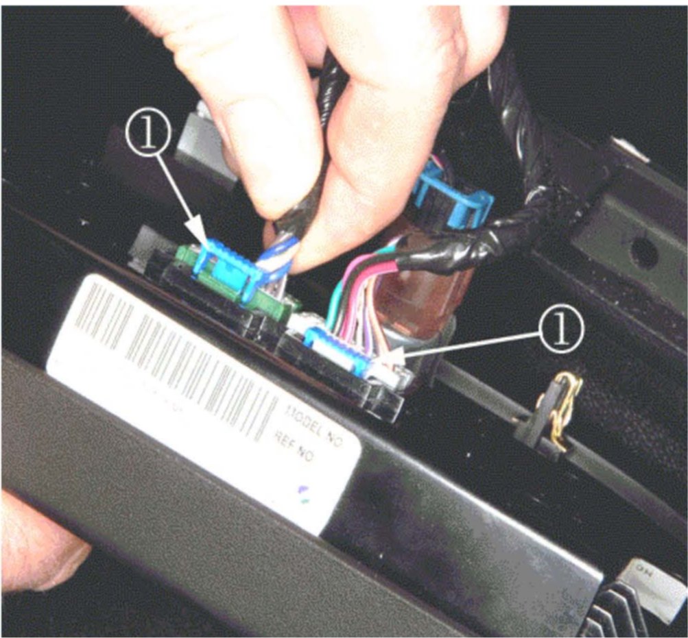Disengage the blue connector locks (1) for each 16-way connector on the RSA trim plate.