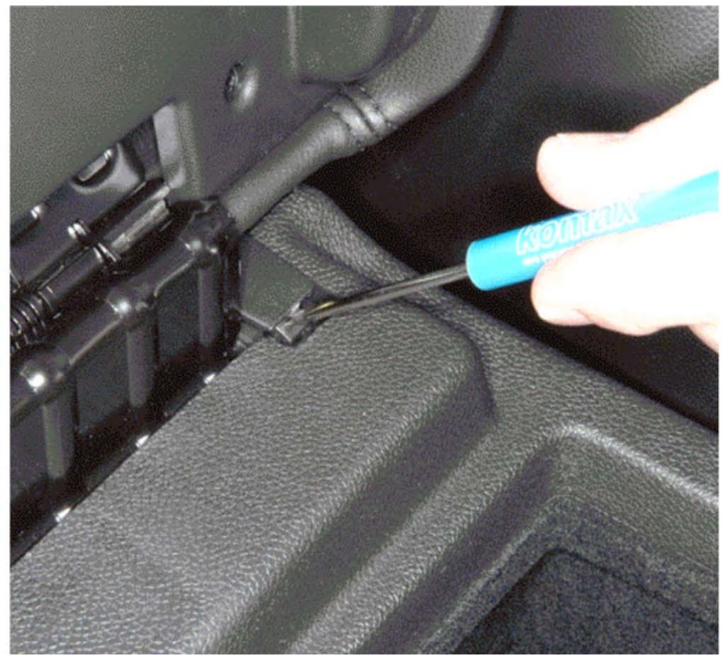 Using trim removal tool (tool D), press down and rearward to release the RSA removal tabs. The tabs are located on the right and left side of the arm rest hinge.