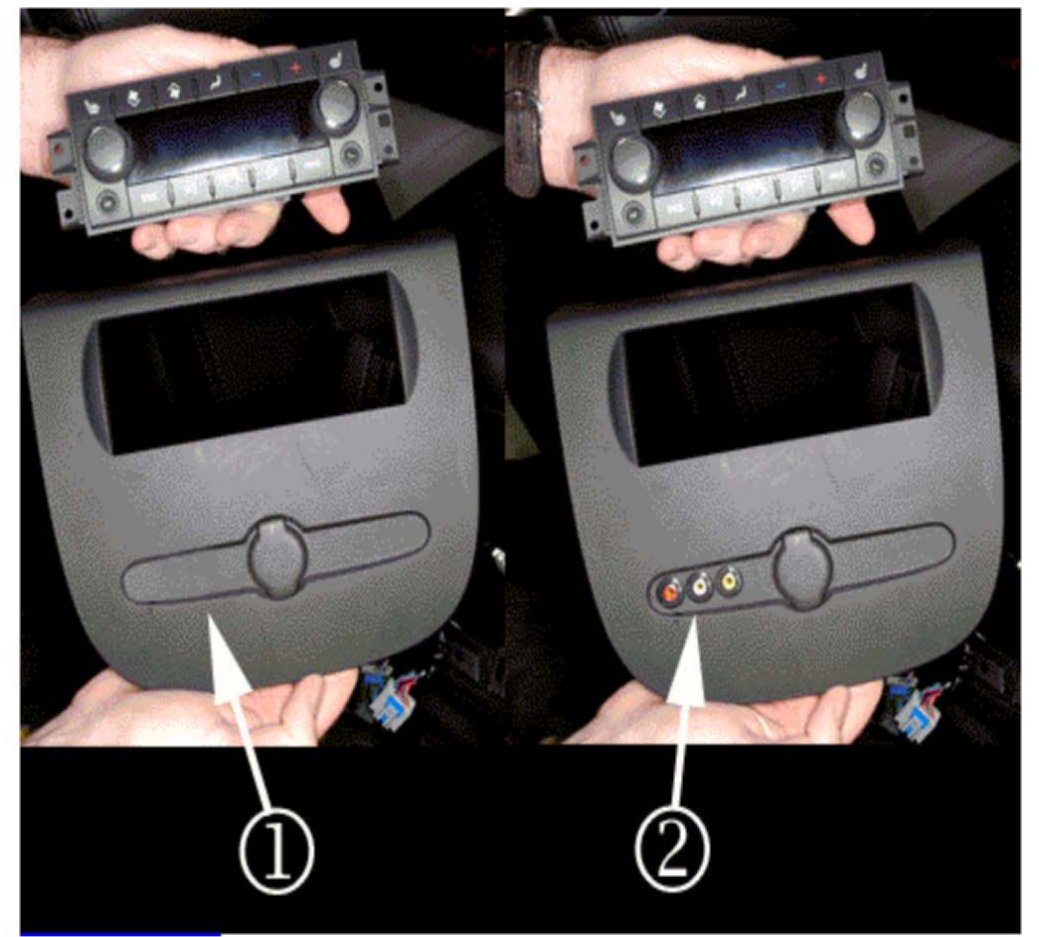 Install the RSA module into the new RSA trim plate. The new RSA trim plate has audio/video jacks (2).