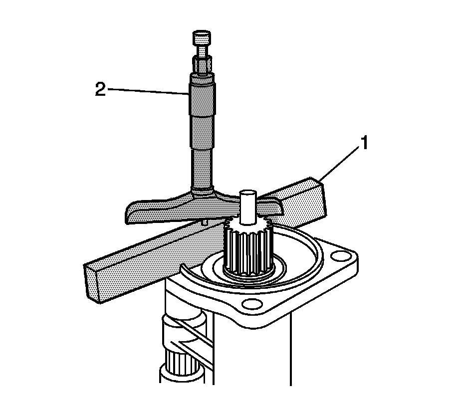 5. Install the J 34673 (1) and the J 34672 (2) onto the inner shaft housing as shown.