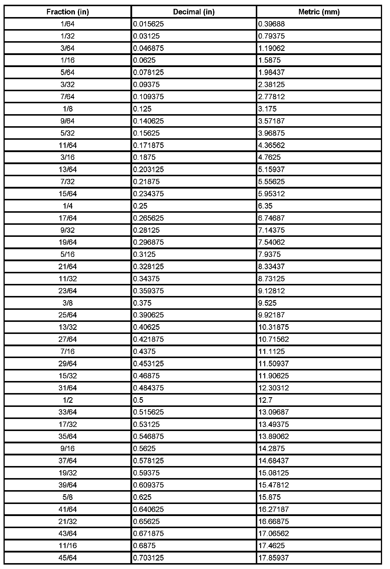 Decimal and Metric Equivalents
