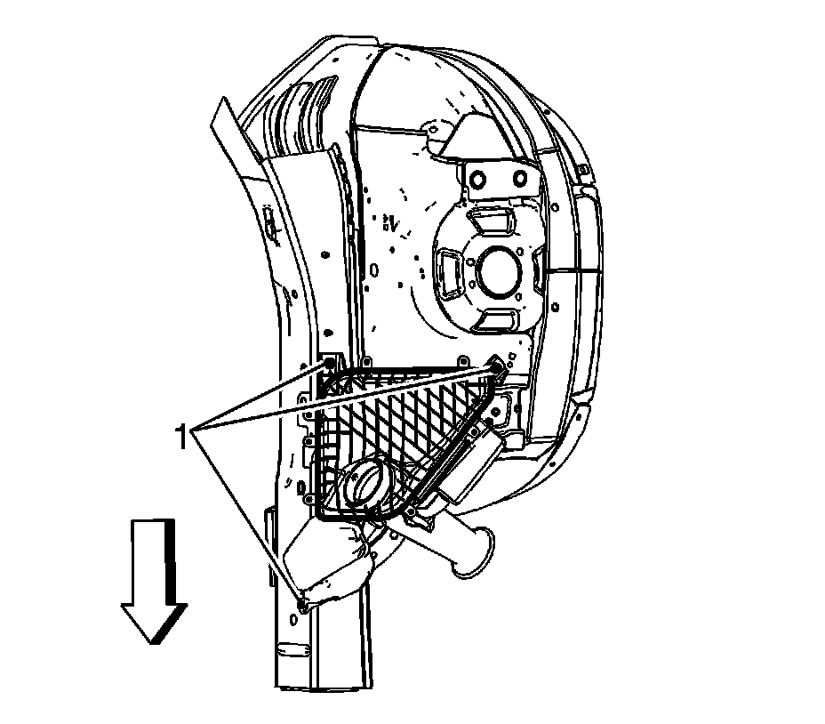5. Install the hood release cable clip (1) to the air cleaner lower housing.