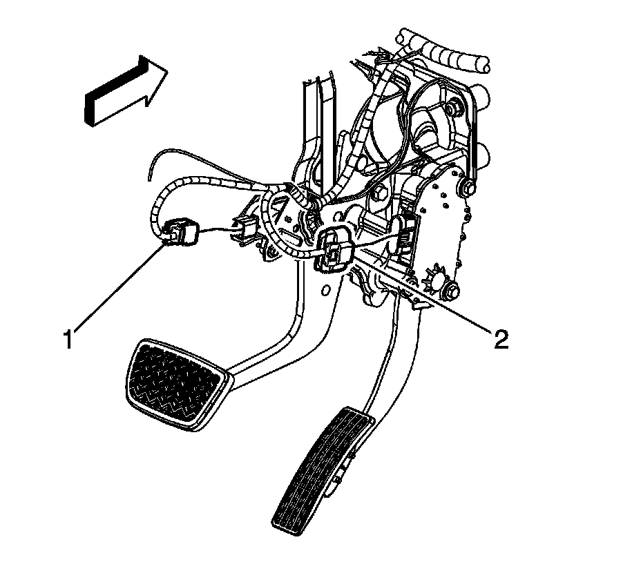 3. Remove the instrument panel wiring harness electrical connector (2) from the accelerator pedal position (APP) sensor assembly.