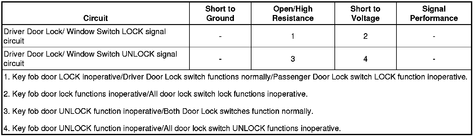If the door locks do not LOCK, test for a short to voltage or open/high resistance in the Driver Door Lock/ Window Switch LOCK signal circuit.