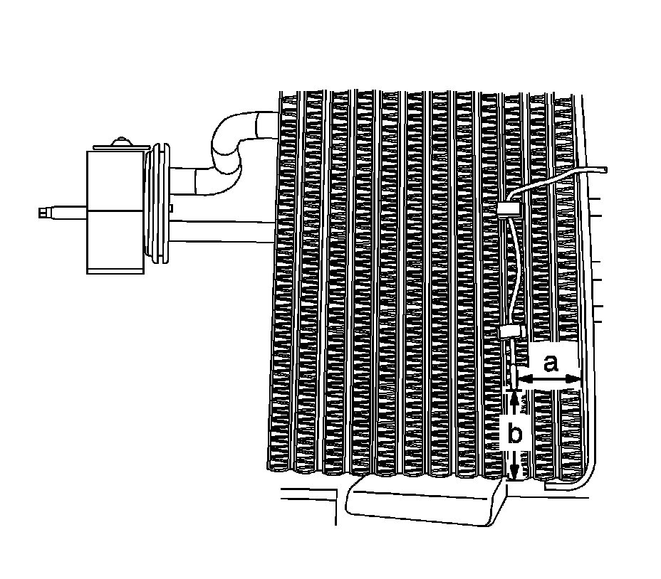 1. Install the evaporator temperature sensor to the evaporator core. Place the sensor approximately 3.5 cm (1.4 in) from the side (a) and 5 cm (2 in) from the bottom (b) corner of the evaporator core.