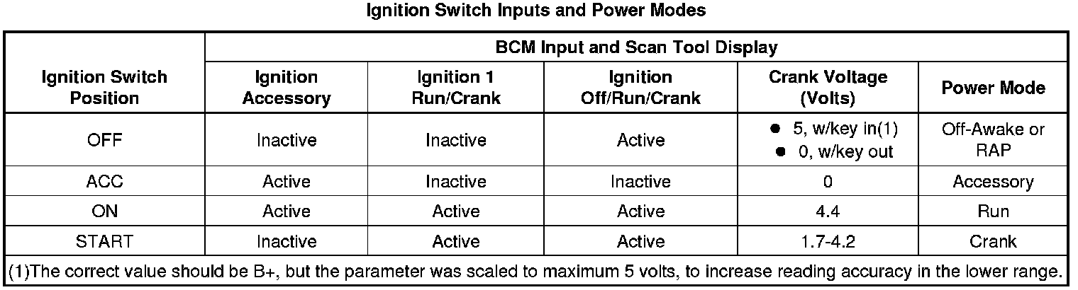 The body control module (BCM) monitors the ignition inputs Ignition Off/Run/Crank, Ignition 1 Run/Crank and the Ignition Accessory signals supplied from the ignition switch. The BCM uses the sequence that the signals appear, their voltage levels and the engine run flag (ERF) status to determine the power mode. Battery voltage is supplied to the ignition switch by the BATT IGN SWITCH fuse. The BCM provides a 5-volt supply voltage to the ignition switch then back to the BCM. The table below shows the correct ignition switch inputs and power modes.