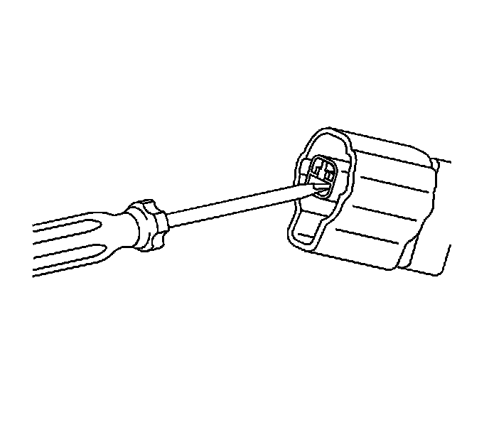 5. Insert the J 38125-553 (GM P/N 15315247) on a slight upward angle into the cavity below the terminal to be removed. Ensure that the pointed on the end of the tool is facing the bottom of the terminal and it stays in contact with the terminal until it stops on the plastic terminal retainer. See the release tool cross reference in the Reference Guide of the J-38125 to ensure that the correct release tool is used.