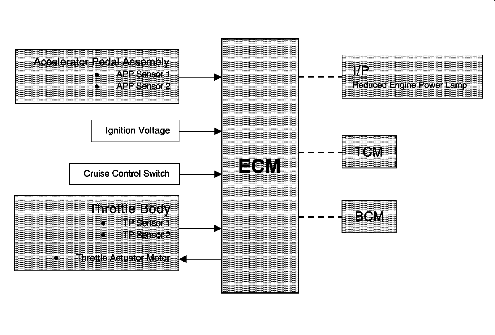The engine control module (ECM) is the control center for the throttle actuator control (TAC) system. The ECM determines the driver's intent based on input form the accelerator pedal position sensors, then calculates the appropriate throttle response based on the throttle position sensors. The ECM achieves throttle positioning by providing a pulse width modulated voltage to the throttle actuator motor. The throttle blade is spring loaded in both directions, and the default position is slightly open.
