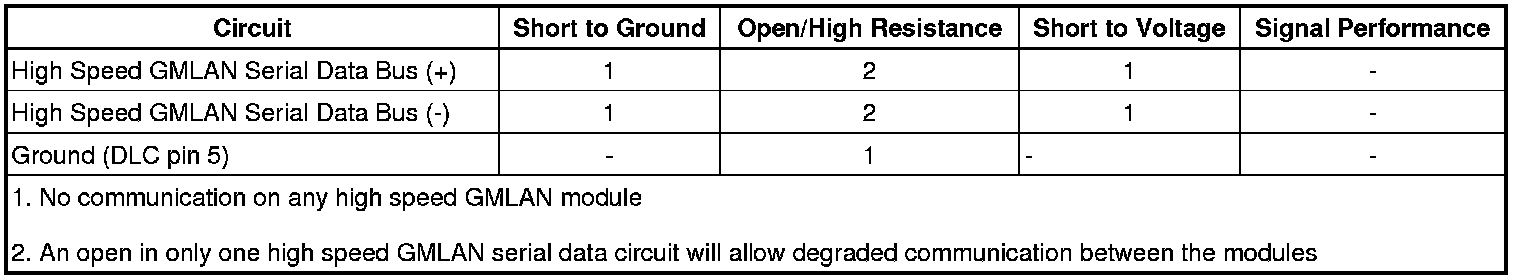 - Any of the high speed GMLAN serial data circuits shorted to ground or voltage