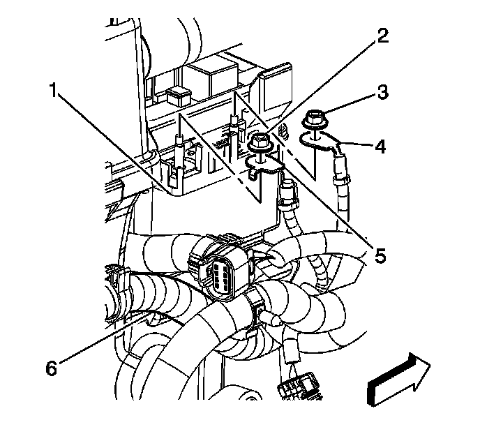4. Remove the nut (2) securing the generator positive cable (5) to the underhood fuse block (1).