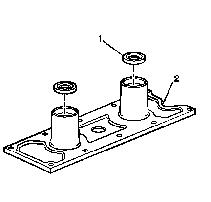 2. Install the knock sensor oil seals (1) into the engine valley cover (2).