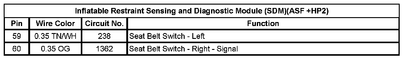Inflatable Restraint Sensing And Diagnostic Module (SDM)(ASF +HP2) (Pin 59 To 60):