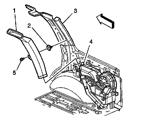 10. Remove the fastener (5) for the upper auxiliary air duct (1). Carefully slide the duct up, into the headliner, until the bottom edge of the duct is above the air distributor duct.