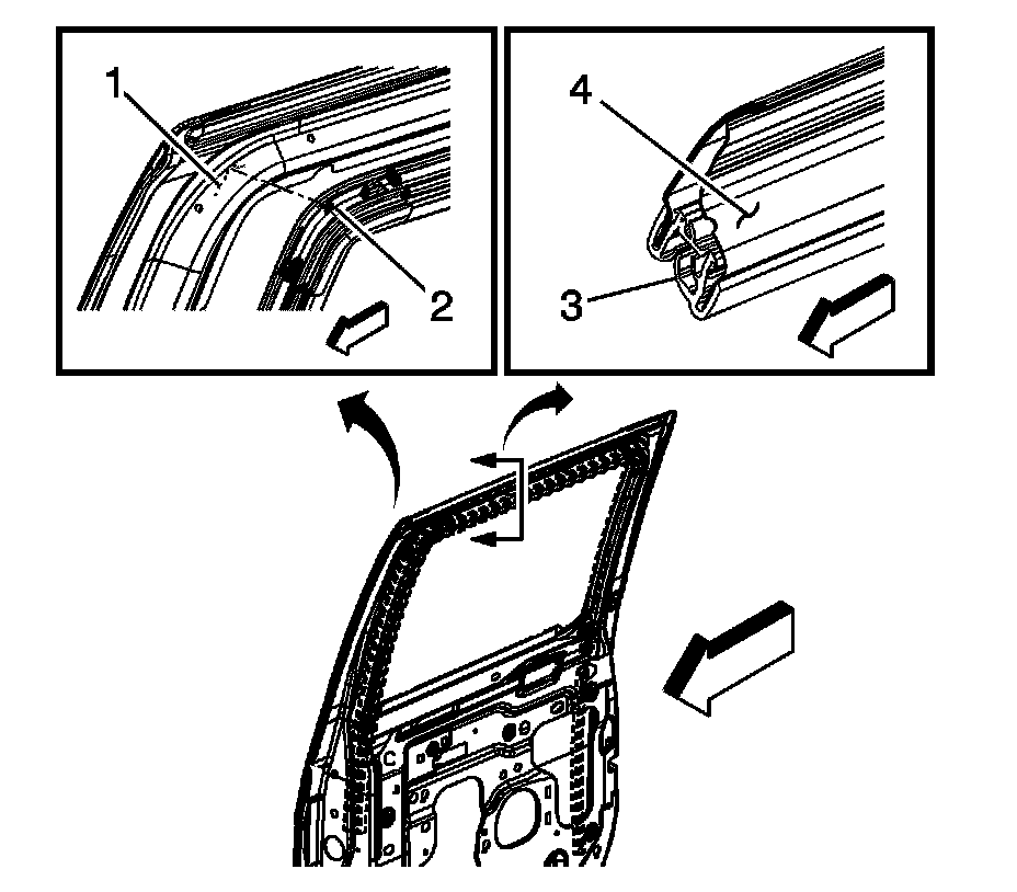 4. Install the rear window outer belt sealing strip. Refer to Rear Side Door Window Outer Sealing Strip Replacement (Rear Side Door Window Outer Sealing Strip Replacement).