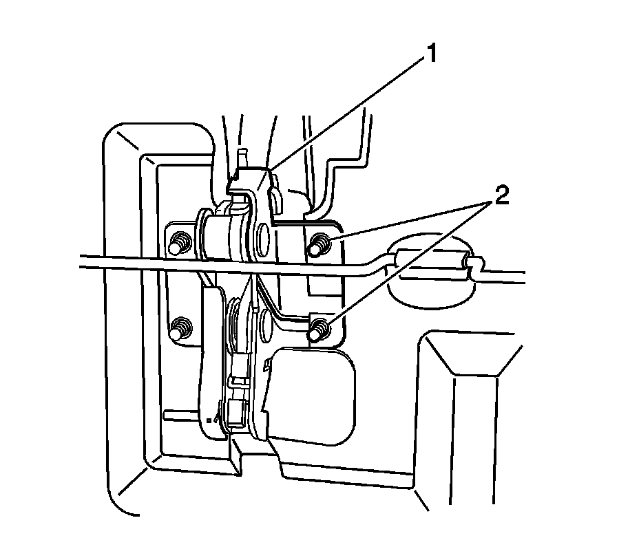 2. Install the 2 screws (2) securing the latch release strap bracket (1) to the seat back frame.