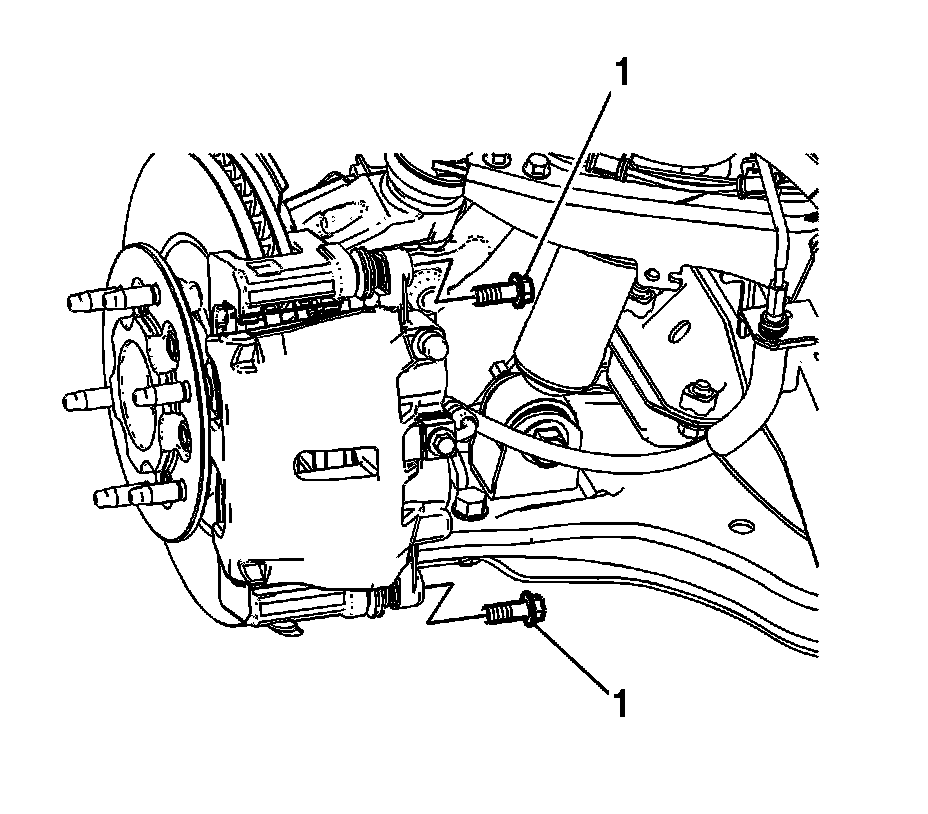 Caution: Support the brake caliper with heavy mechanic wire, or equivalent, whenever it is separated from its mount and the hydraulic flexible brake hose is still connected. Failure to support the caliper in this manner will cause the flexible brake hose to bear the weight of the caliper, which may cause damage to the brake hose and in turn may cause a brake fluid leak.