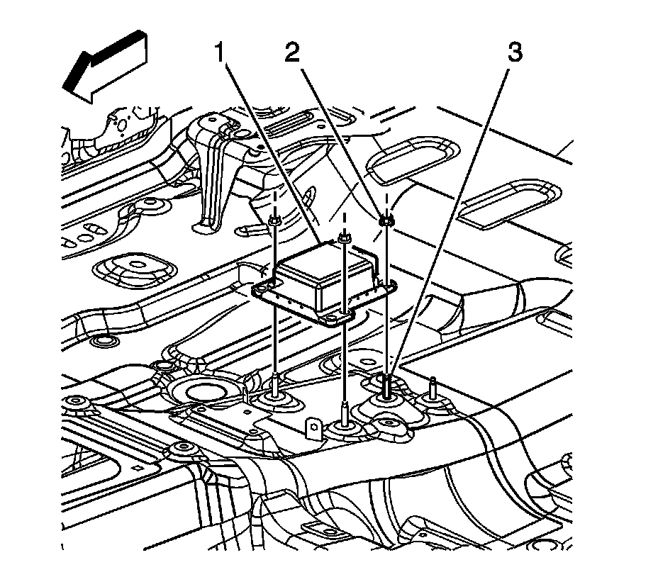 6. Remove the nuts (2) retaining the SDM (1) to the floor studs (3).