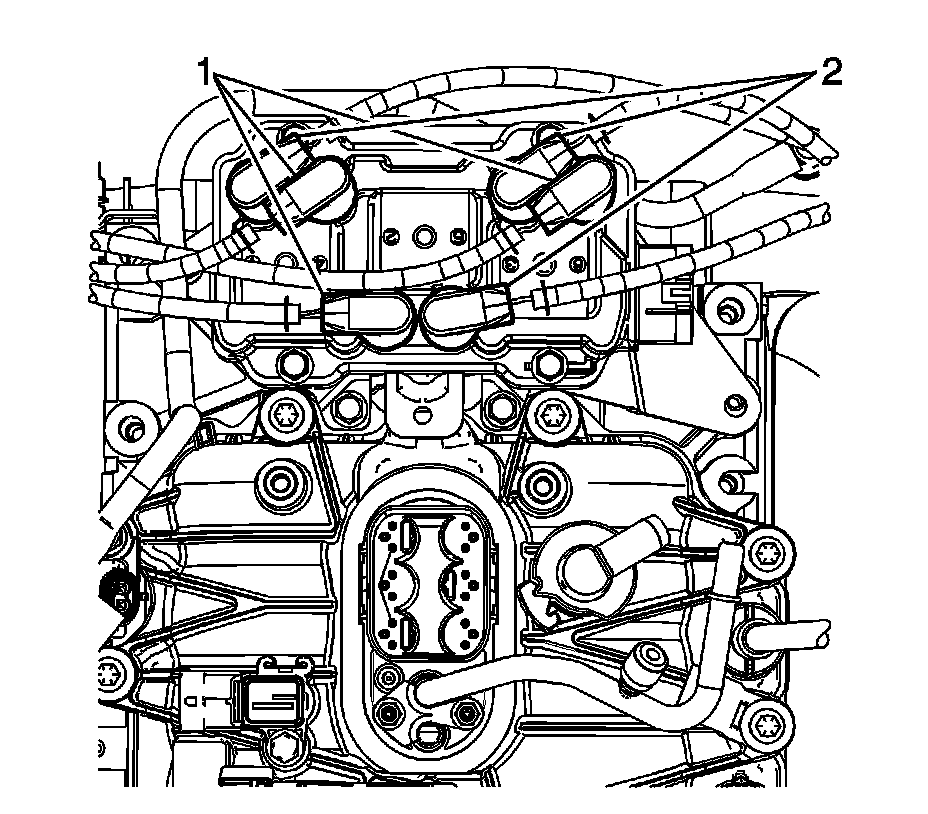9. Disconnect the spark plug wires (1, 2) from the ignition coil.