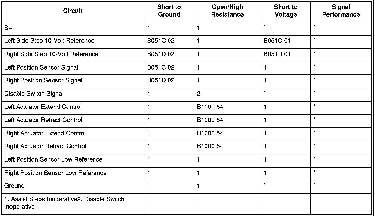 The assist step control module (ASC) controls the assist step actuators to extend or retract the assist steps. Each actuator consists of an electric motor and a potentiometer. The module supplies a low reference and 10-volt reference source voltage to the potentiometer. The ASC module monitors the voltage drop across the potentiometer on the position signal circuit. When the actuator shaft rotates, the voltage on the position signal circuit changes. The ASC module supplies the actuator motor with a 12-volt control circuit and a ground control circuit. The ASC module controls the direction of the actuator by changing the polarity of the control circuits.