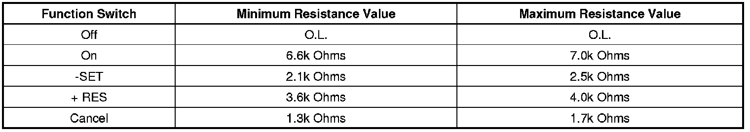 2. Cruise control switch ON, measure the resistance between terminal 1 and terminal 3 while individually activation and holding each cruise control function switch and compare the resistance reading to the values in the table below.