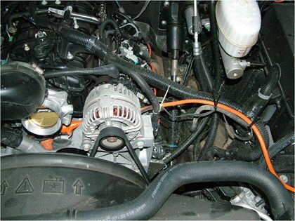 8. Route the engine coolant heater cord and extension cord behind the alternator and adjacent to the engine coolant crossover pipe as shown.