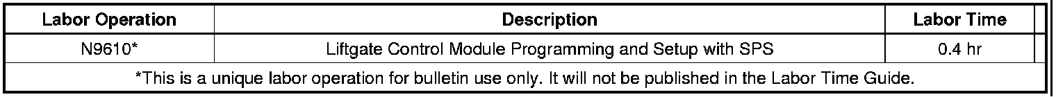 A revised calibration has been developed to address this condition. Technicians are to reprogram the Power Liftgate Module using the Service Programming System (SPS) with the latest software available on TIS2WEB. Refer to the Liftgate Control Module Programming and Setup procedures in SI. As always, make sure your Tech 2(R) is updated with the latest software version.