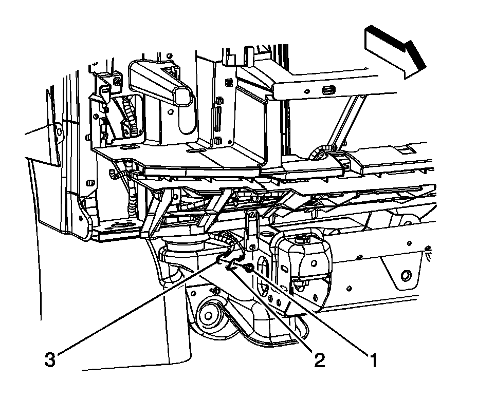 10. Route the negative battery cable terminal (3) through the opening between the radiator support and frame.