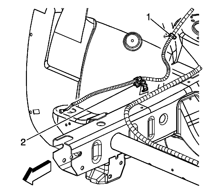 11. Remove the negative battery cable clip (2) from the chassis harness.