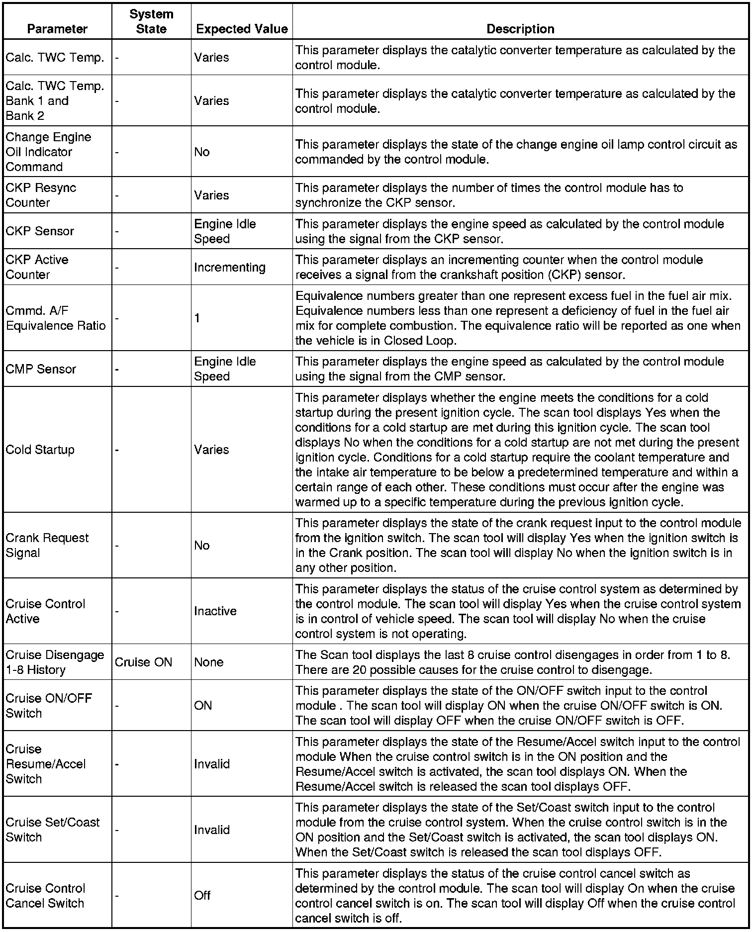 The Engine Control Module Scan Tool Data List contains all engine-related parameters that are available on the scan tool. The list is arranged in alphabetical order. A given parameter may appear in any one of the data lists, and in some cases may appear more than once, or in more than one data list in order to group certain related parameters together.