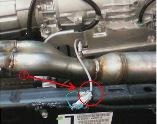 7. Inspect the harness to ensure that the pigtail wires of the O2 sensor are adequately protected from direct contact with the frame rail (1), with the added anti-abrasion tape.
