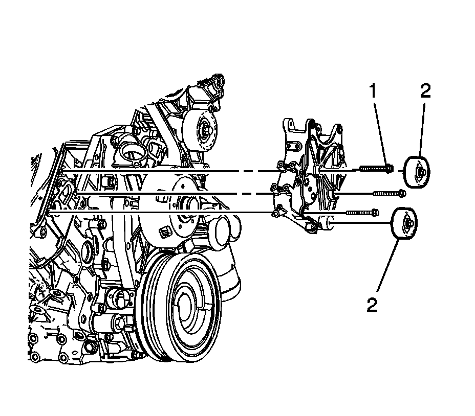 1. If the generator bracket was replaced, install the idler pulleys to the generator bracket and tighten the pulley bolts (2).
