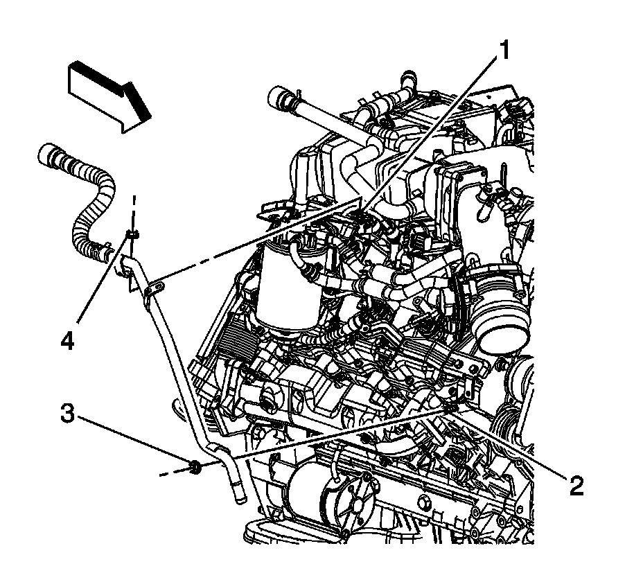 10. Remove the heater inlet hose bracket nut (4) from the fuel filter adapter stud (1).