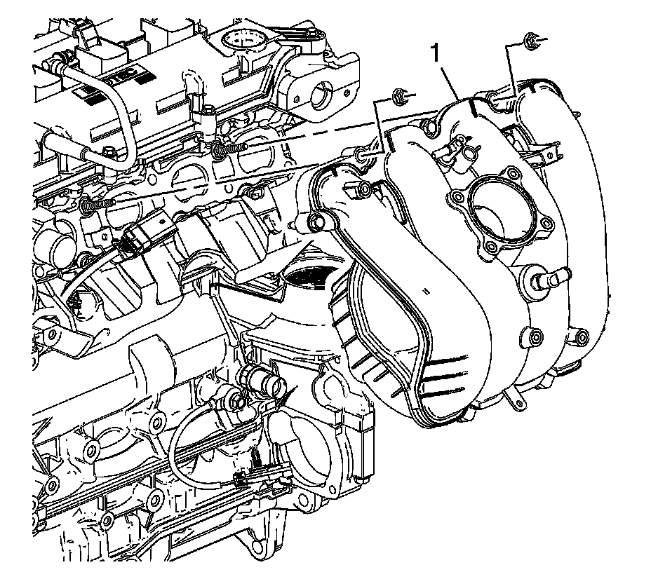 2. Install the intake manifold (1). Start and hand tighten the intake manifold bolts and nuts.