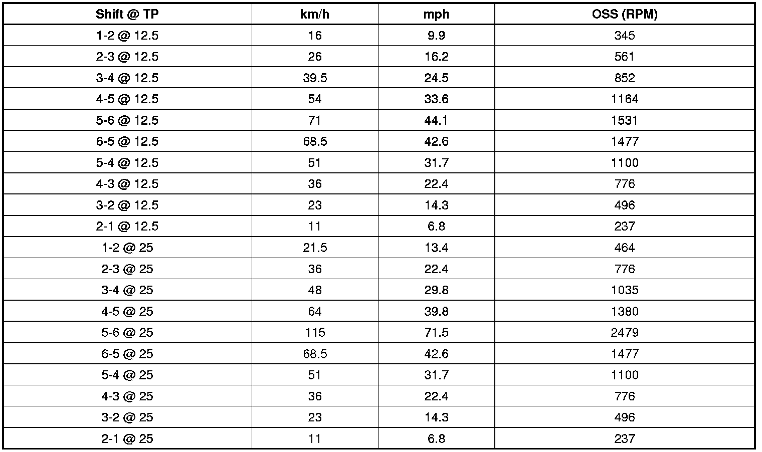Note: Shift speed points are affected by many different vehicle and transmission operating conditions. The table above represents shift speed points calibrated at specific throttle angles during normal operating conditions and a temperature range between 0-130°C (32-266°F). These shift speed points are also based on an effective final drive ratio of 3.16, and assume a production-intent tire size. The table below illustrates a number of different variables that influence these shift speed points. Based on a given operating condition, these variables may override the normal shift speed points. To assist in monitoring the different variables, the respective scan tool data parameter is also listed.