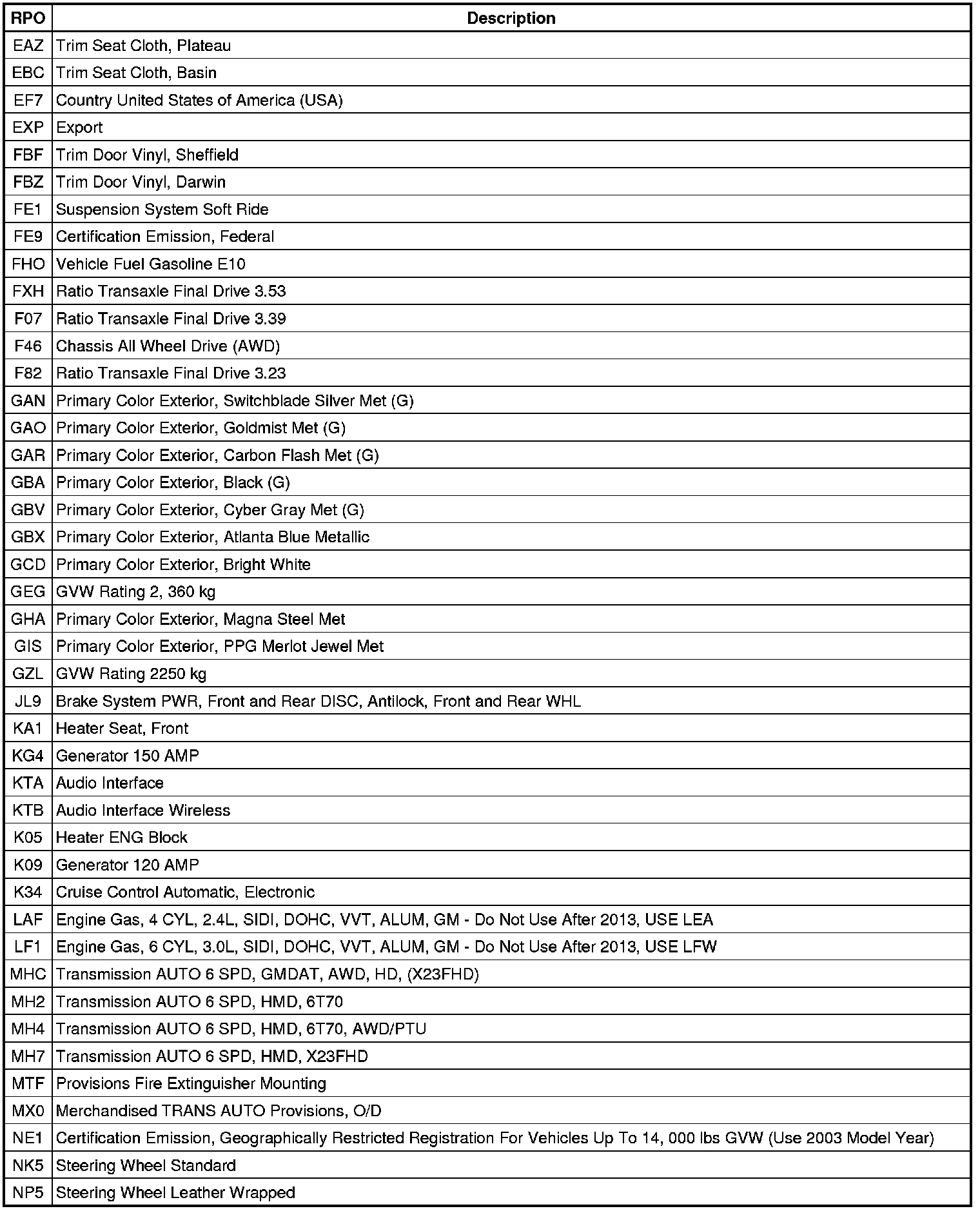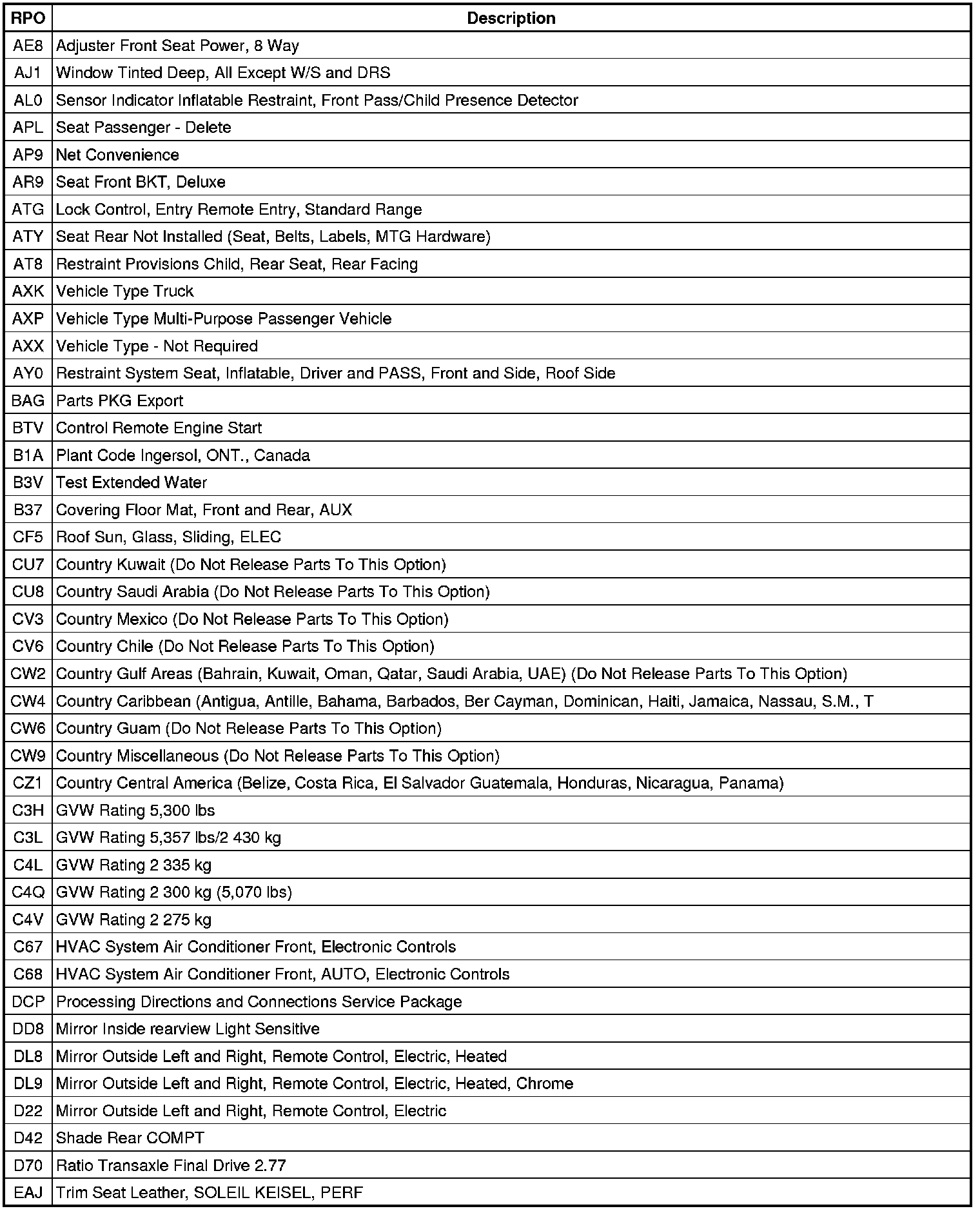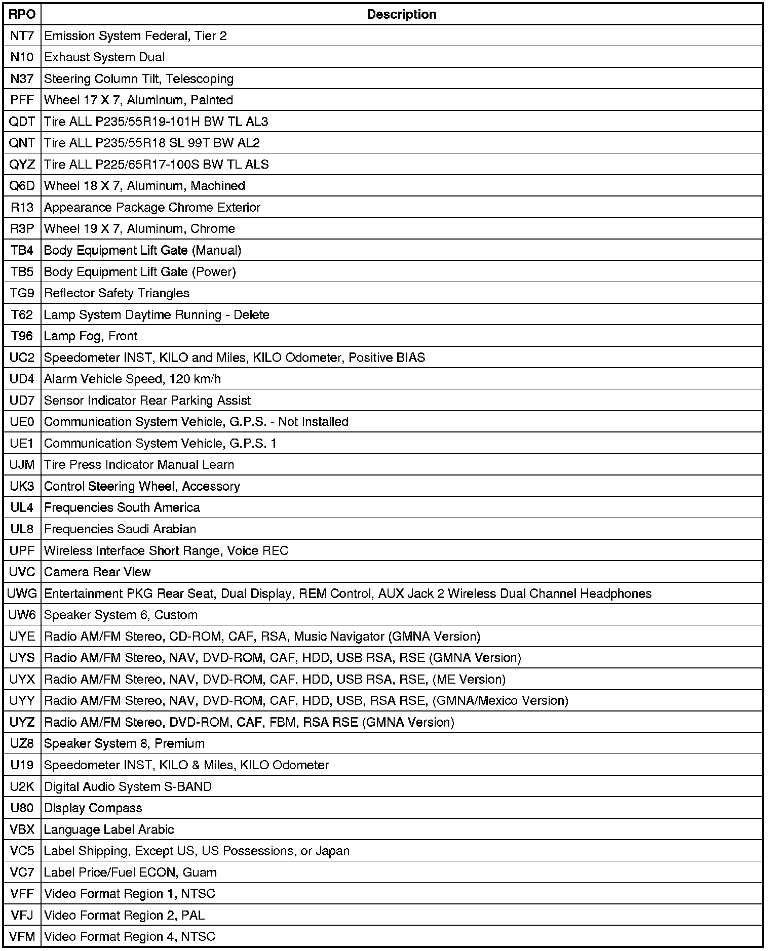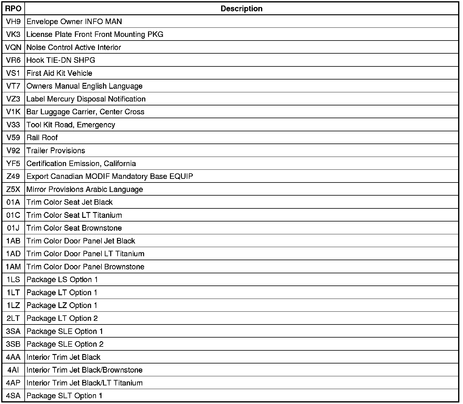 The following table provides the description of the RPO codes that are available on the vehicle. The vehicles RPO list is printed on the Service Parts Identification Label.