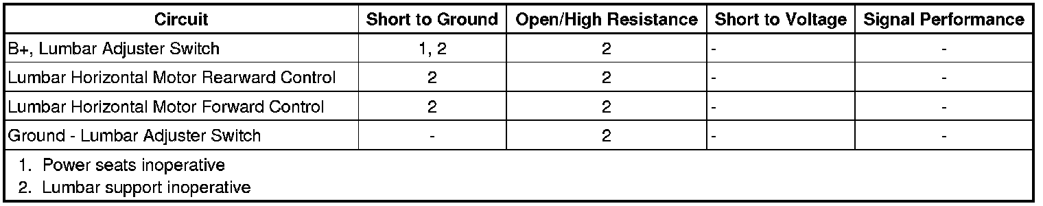 The lumbar motor is reversible. For example, when the lumbar horizontal forward switch is pressed to move the lumbar support forward, battery voltage is applied through the switch contacts and the lumbar motor forward control circuit to the motor. The motor is grounded through the lumbar motor rearward switch contacts and the lumbar motor rearward control circuit to the motor. The motor runs in order to drive the lumbar support forward toward the occupants back until the switch is released. Moving the lumbar support rearward works similarly to moving the lumbar support forward, except that battery positive voltage and ground are applied on opposite circuits causing the motor to run in the opposite direction.