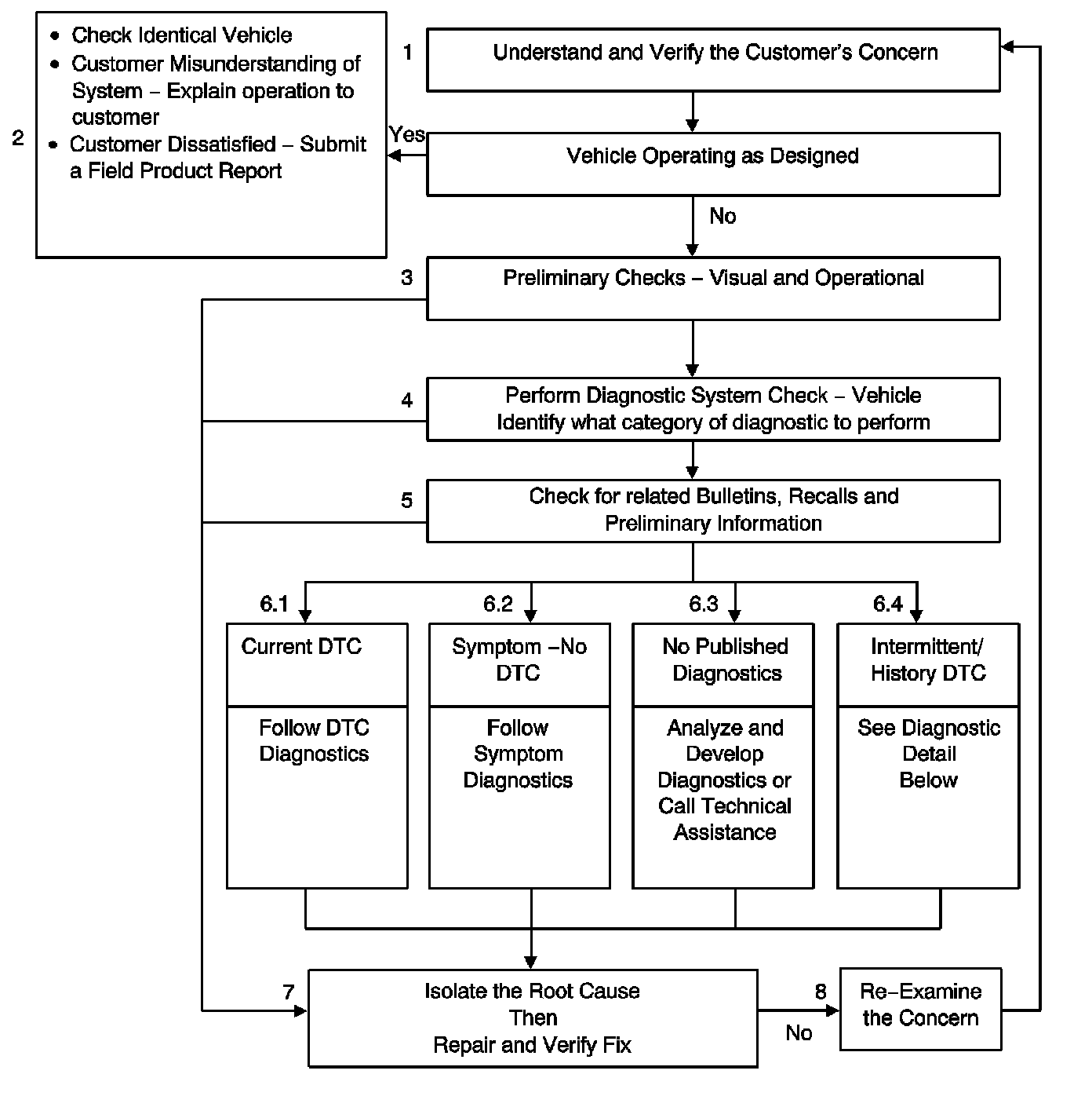 8. Re-examine the Concern: If a technician cannot successfully find or isolate the concern, a re-evaluation is necessary. Re-verify the concern. The concern could be an intermittent or normal condition.