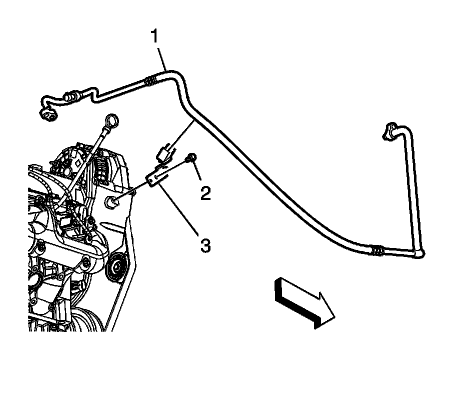 8. Install the heater outlet hose clamp bolt (1) at the generator bracket.