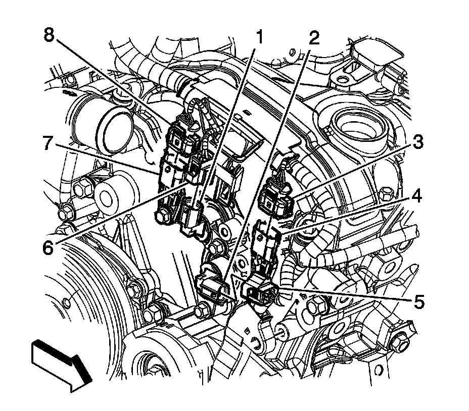 5. Disconnect the engine wiring harness electrical connector (8) from the bank 2 intake camshaft position (CMP) sensor (7).