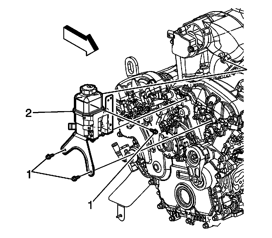 4. Remove and reposition the power steering fluid reservoir bracket (2) out of the way.