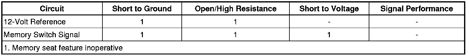 Reference voltage is supplied to the memory seat adjuster switch from the driver door lock/window switch. When a memory switch is pressed, reference voltage is applied through the switch contacts, a series of resistors and thorough the memory switch signal circuit to the door lock/window switch. The door lock/window switch then sends a serial data message to the memory seat module (MSM) indicating the memory recall request. The MSM then commands the appropriate seat motors to move to the pre-recorded seat positions stored in memory in response to the switch input.