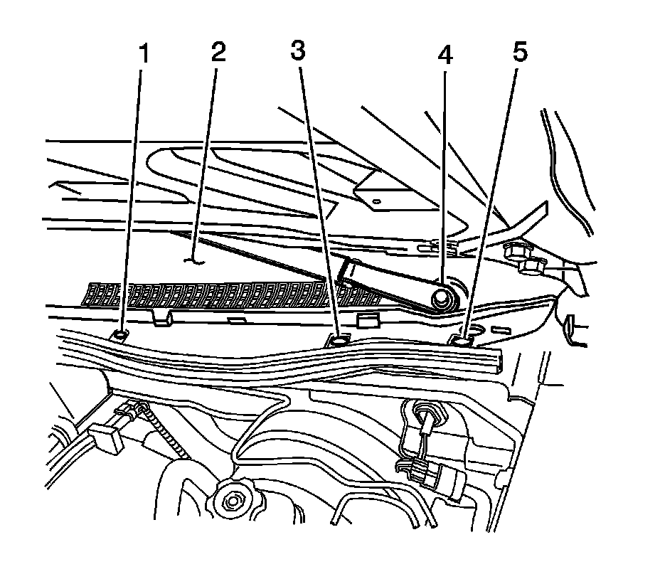 4. Remove the retainers (1, 3, 5) securing the air inlet panel grille (2) to the cowl panel.