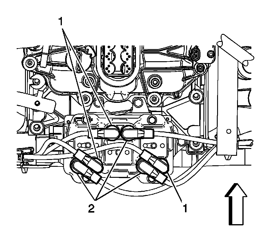 2. Remove the appropriate bank 1 spark plug wire boot(s) (1), or bank 2 spark plug wires boot(s) (2) from the ignition coil.