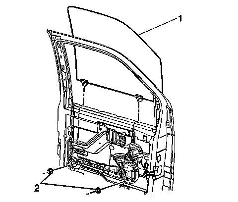9. Remove the nuts (2) that retain the front door window (1) to the sash.
