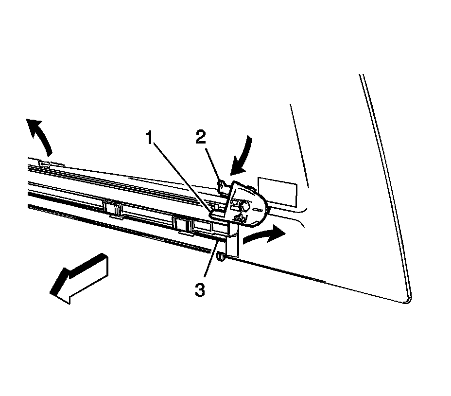 Note: Use a suitable tool to release the tabs (1) from the rear sliding window pulley (3).