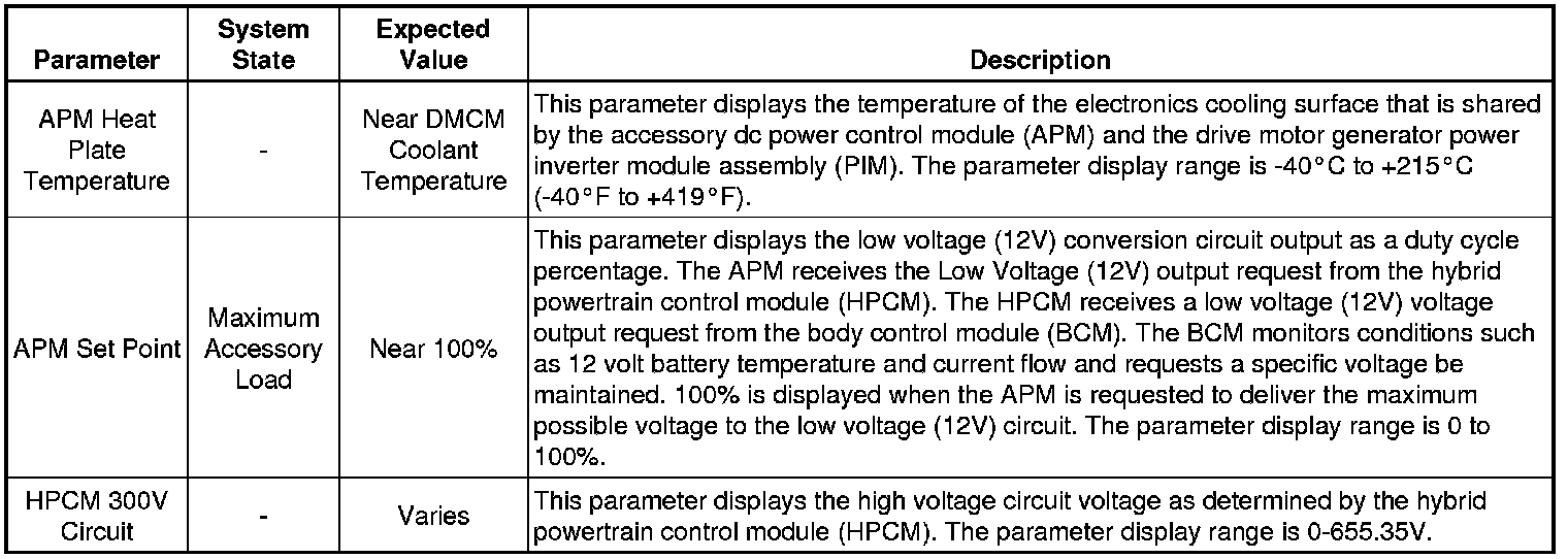 Only the parameters listed below are referenced in this service manual for use in diagnosis. If all values are within the typical range described below, refer to Symptoms - Hybrid Controls for diagnosis.