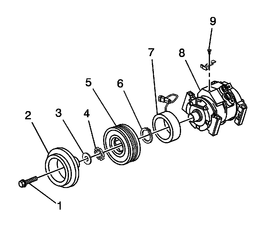 1. Remove the air conditioning (A/C) compressor. Refer to Air Conditioning Compressor Replacement (4.3L) Air Conditioning Compressor Replacement (4.3L)Air Conditioning Compressor Replacement (4.8L, 5.3L, or 6.0L) Air Conditioning Compressor Replacement (4.8L, 5.3L, or 6.0L).