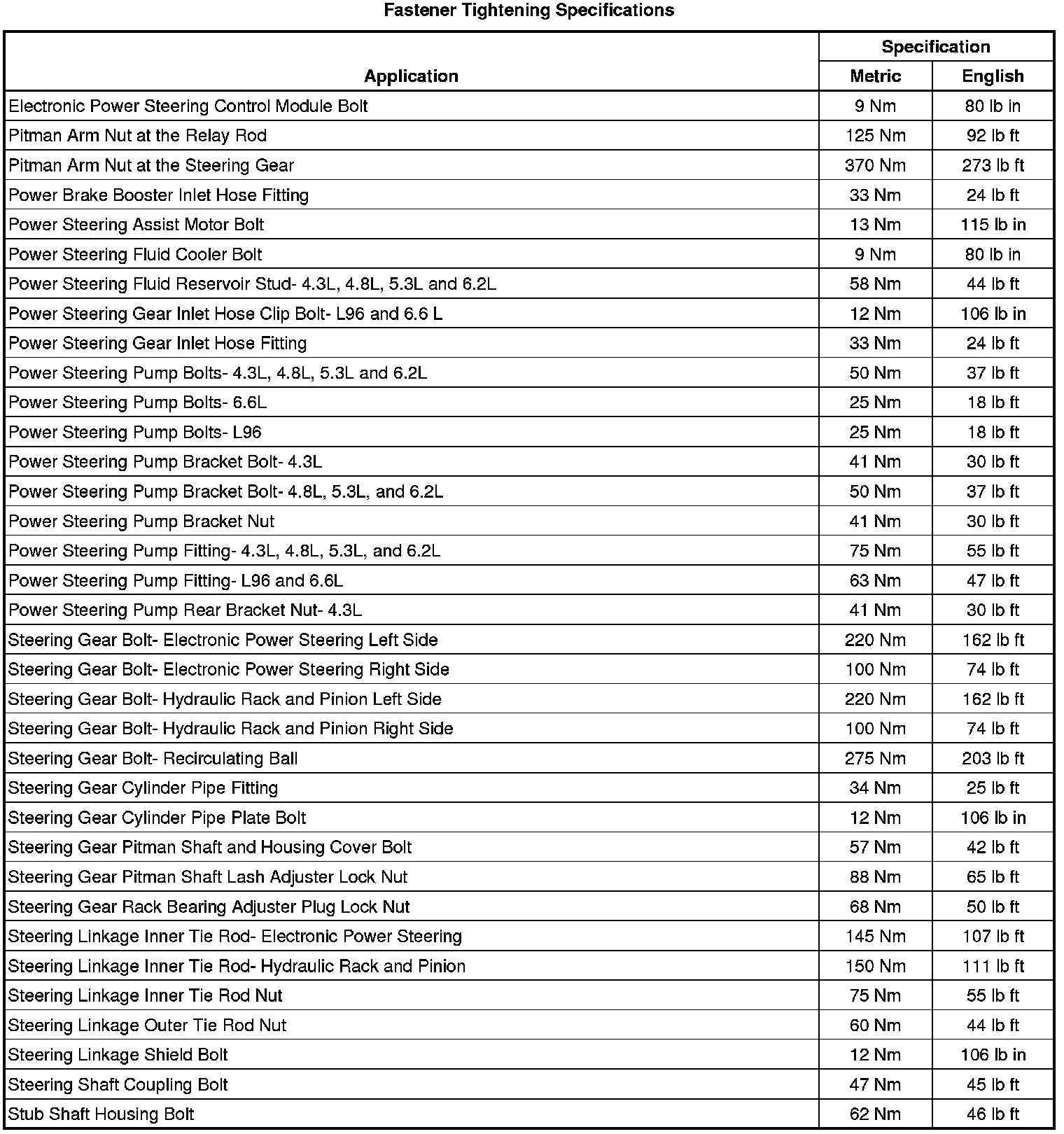 Fastener Tightening Specifications